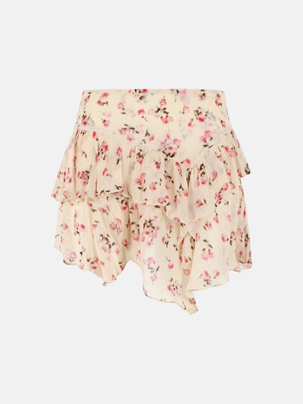 Side closure with hidden zip and hook, decorative ruffles, floral pattern