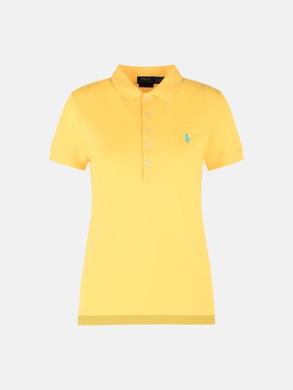 Classic collar, partial button closure, logo embroidery on the chest, short sleeves, hem with side slits