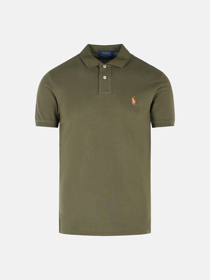 Slim fit, ribbed polo collar, two-button closure, green logo embroidery on the chest, longer hem at the back with side slits