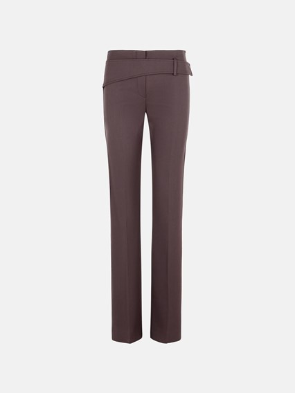 'BANDA' SLIM TROUSERS WITH ASYMMETRIC BELT IN COFFEE VIRGIN WOOL BLEND