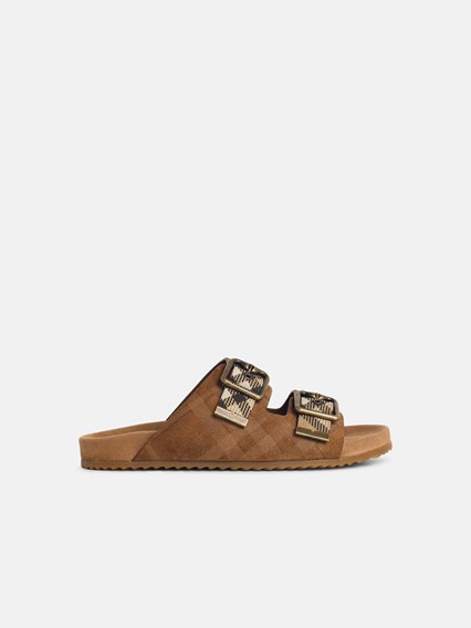 Top adjustment with buckle straps, embossed 'Burberry Check' pattern, suede insole with embossed logo, rubber sole