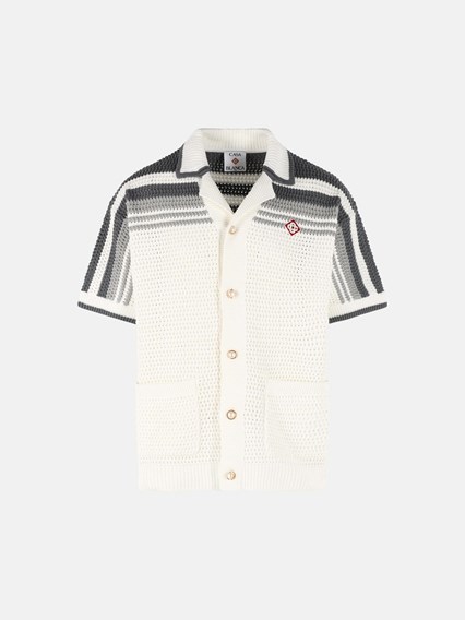 Crochet pattern, gray top details, lapel collar, button closure, logo patch on the chest, front patch pockets, ribbed hem and cuffs