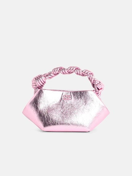 Crack-effect metallic texture, tone-on-tone 'GANNI Butterfly' logo, embossed 'GANNI' logo on the back of the bag, braided top handle, metal dice engraved with the 'GANNI' and 'Butterfly', adjustable and removable shoulder strap, snap button closure, one compartment\n25 x 11.5 x 11 cm