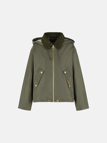 Ribbed collar, front zip closure, front pockets with snap button, adjustable drawstring at the hem