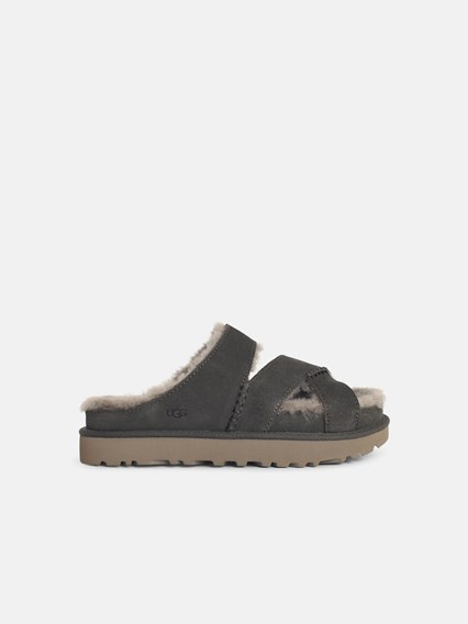 Crossover design, sheepskin lining, embossed 'UGG' logo on the side, sugar cane 'EVA' sole