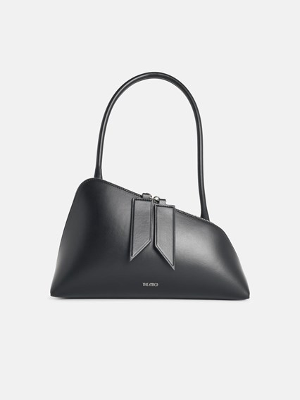 Made of smooth leather, logo printed on the front, zip closure, single handle, one inner flat pocket \ 29 x 18 x 5 cm