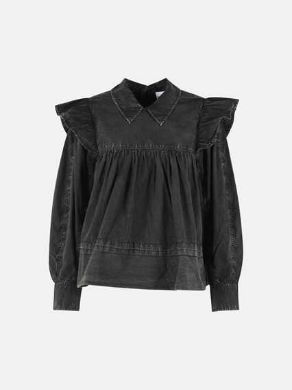 Pointed collar, back button closure, ruffle on the shoulders, decorative curl, button cuffs