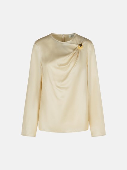 Made of silk twill, straight silhouette with draped detail along the neckline, metal ornament, crew neck and long flared sleeves
