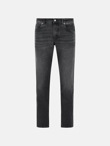 Belt loops, zip and button closure at the waist, five-pocket style, iconic metal logo appliqué