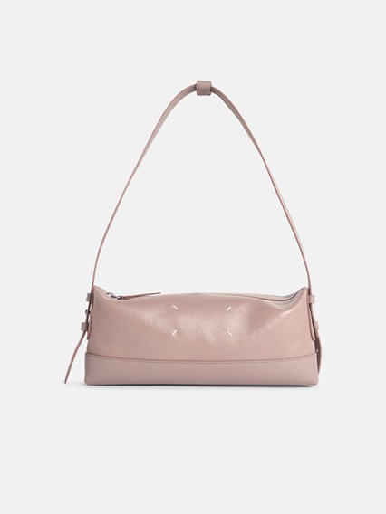 Wrinkled shiny leather effect, adjustable shoulder straps with buckle, logo patch on the front, zip closure, four stitching on the back, stamped logo inside \ 28 x 11.5 x 8 cm
