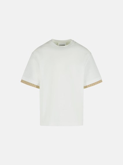 Oversize and boxy cut, soft shoulders, single t-shirt with double layer effect, 'Jil Sander' logo label on the shoulder, striped cotton sleeves underneath, technical compact cotton jersey fabric
