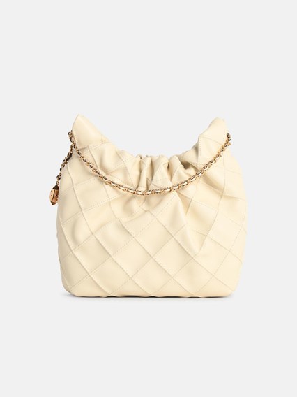 Embossed diamond pattern, double chain handle, magnetic closure, fixed chain shoulder strap with logo pendant, cotton lining\n22 x 18 x 7 cm