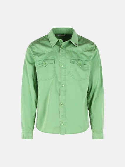Pointed collar, 'Medusa' brooch, front button closure, front pockets with flap and button, button cuffs
