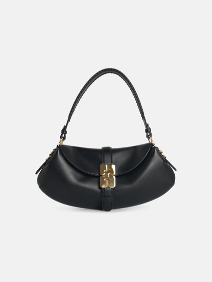 curved Silhouette, flap closure, shoulder strap, 'Ganni Butterfly' logo, 'D Ring' details, single compartment, open inside pocket\n36 x 18 x 4 cm