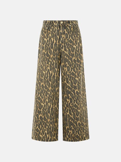 Cotton denim pants with wide leg, belt loops, covered zip and button closure, five-pocket style, logo back patch, leopard print