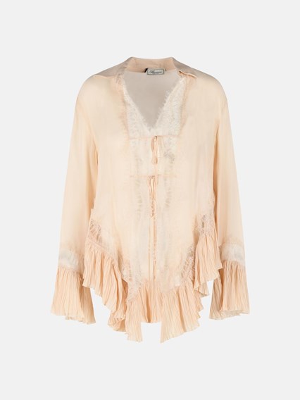 Pointed collar, decorative and structural lace inserts, ruffled cuffs, front lace closure, pleated asymmetrical hem