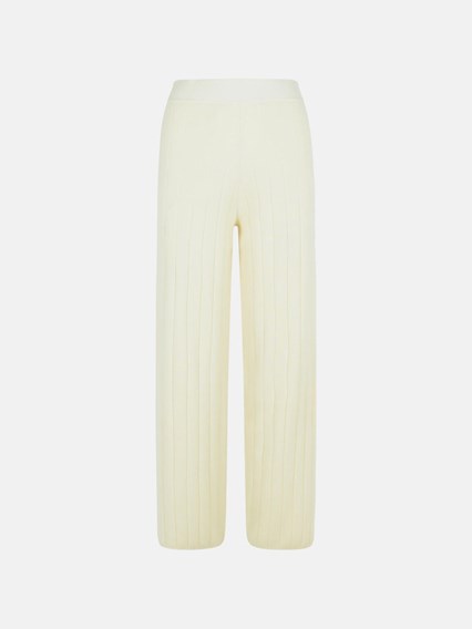 Pantalone in filato di puro cachemire, linea morbida leggermente chiusa al fondo, vita elasticizzata, tasche alla francese sui fianchi, polsino elastico sul fondo, bordi rifiniti a coste