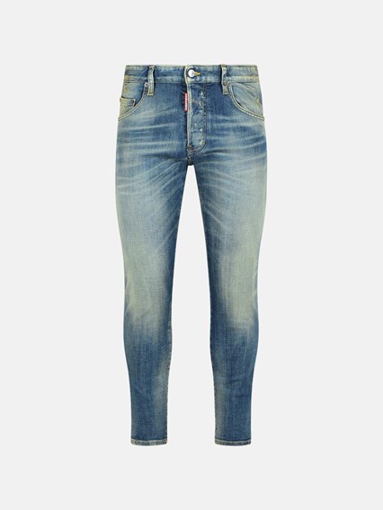 Realizzato in denim di cotone stretch, lavaggio blu medio, vestibilità slim, modello a cinque tasche, effetto vintage, baffature, etichetta logata frontale, patch logata applicata sul retro