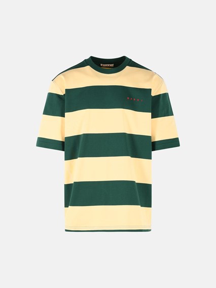Girocollo a costine, motivo a righe orizzontali a contrasto, logo ricamato a contrasto rosso sul petto, orlo con piccoli spacchi laterali
