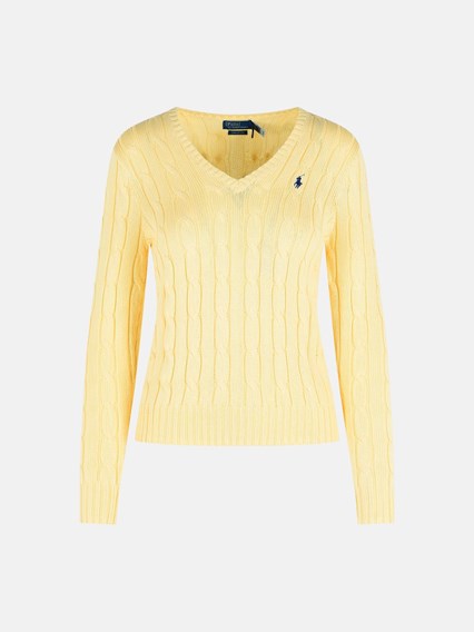 Realizzata a maglia con finitura a treccia, scollo a V rifinito a costine, logo ricamato a contrasto blu sul petto, orlo e polsi a costine