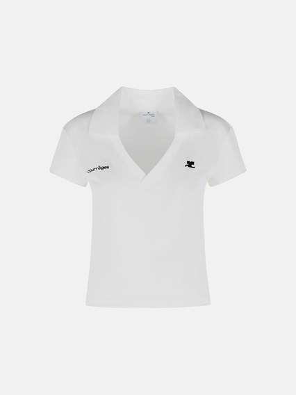 Colletto a costine, scollo a V, logi a contrasto ricamati sul petto, vestibilità aderente