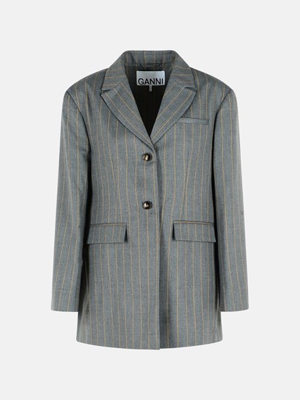 Colletto con rever, chiusura a due bottoni, tasca a filetto sul petto, tasche frontali con patta, motivo a righe verticali, spalle imbottite, etichetta posteriore a tono logata, piega centrale posteriore, una tasca interna a filetto, fodera in misto viscosa