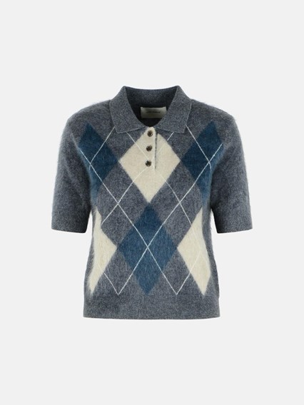 Realizzata a maglia fine di morbido cashmere spazzolato, colletto squadrato, chiusura parziale a bottoni, motivo frontale rombi, maniche corte, orlo e fondo manica a costine, vestibilità regolare