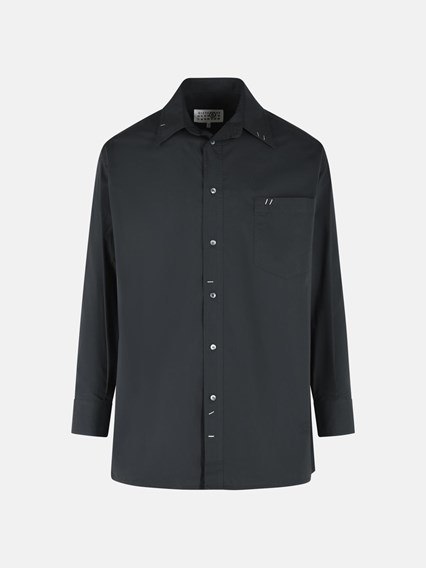 Colletto a punta, abbottonatura frontale, tasca applicata sul petto, applicazione decorativa con graffette, logo ricamato a tono sul fondo, iconica cucitura bianca posteriore