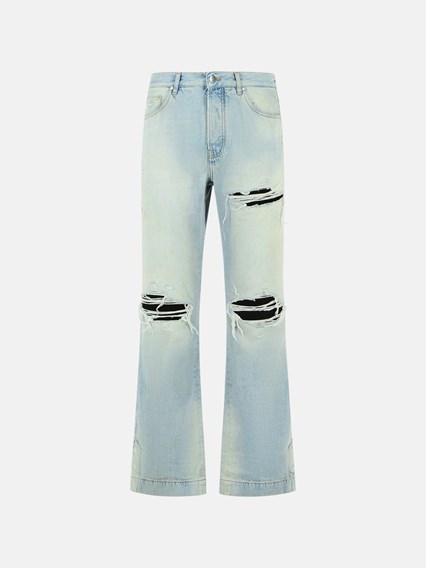 Gamba dritta, vita con passanti, chiusura con bottoni, modello a cinque tasche, effetto vintage e distressed, patch posteriore a contrasto con logo impresso