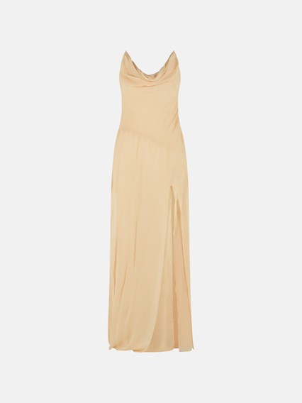 Realizzato in georgette di viscosa, spalline sottili allacciabili sul retro, drappeggio frontale, zip invisibile laterale, fodera in poliestere