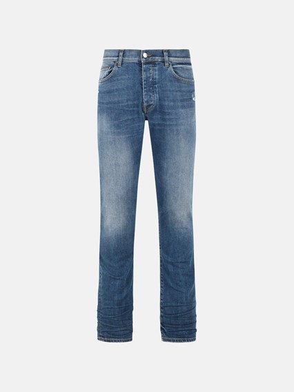 Realizzato in denim elasticizzato, vita con passanti, chiusura a bottoni, modello a cinque tasche, pieghe decorative, effetto distressed, iconica patch logata applicata sul retro