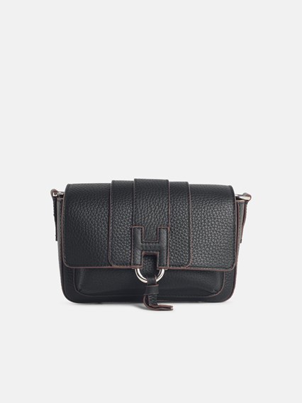 Articolo realizzato in pelle martellata, tasca frontale seminascosta, chiusura con pattina e bottone magnetico, inserto 'H' in rilievo con logo 'Hogan' impresso, tracolla versatile, tasca interna, piedini in metallo\n20 x 12 x 7,5 cm