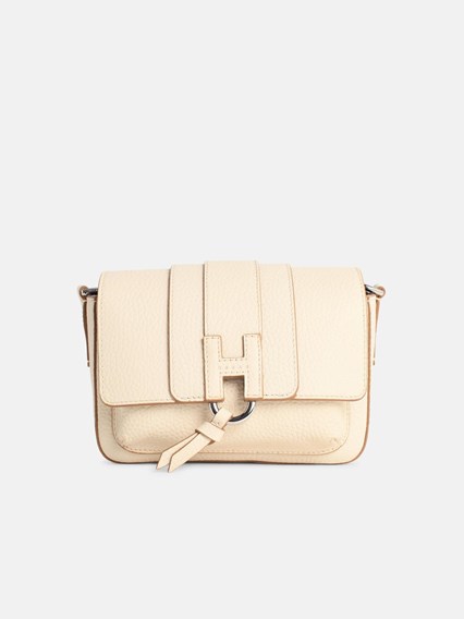 Articolo realizzato in pelle martellata, tasca frontale seminascosta, chiusura con pattina e bottone magnetico, inserto 'H' in rilievo con logo 'Hogan' impresso, tracolla versatile, tasca interna, piedini in metallo\n20 x 12 x 7,5 cm