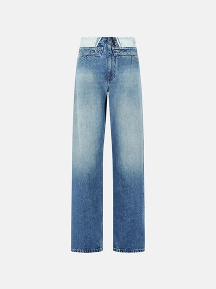 Vestibilità a gamba ampia a tutta lunghezza, dettaglio doppiato della cintura con effetto vissuto, chiusura con zip e bottone sul davanti, iconica cucitura bianca posteriore